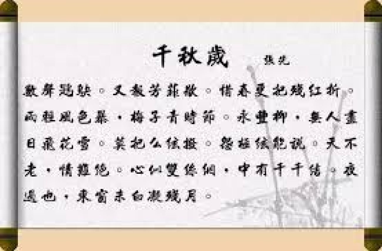 宋朝張先《千秋歲》:數聲鶗鴃,又報芳菲歇。惜春更選殘紅折,雨輕風色暴,梅子青時節。永豐柳,無人盡日飛花雪。莫把麼弦撥,怨極弦能說。天不老,情難絕,心似雙絲網,中有千千結。夜過也,東窗未白凝殘月。