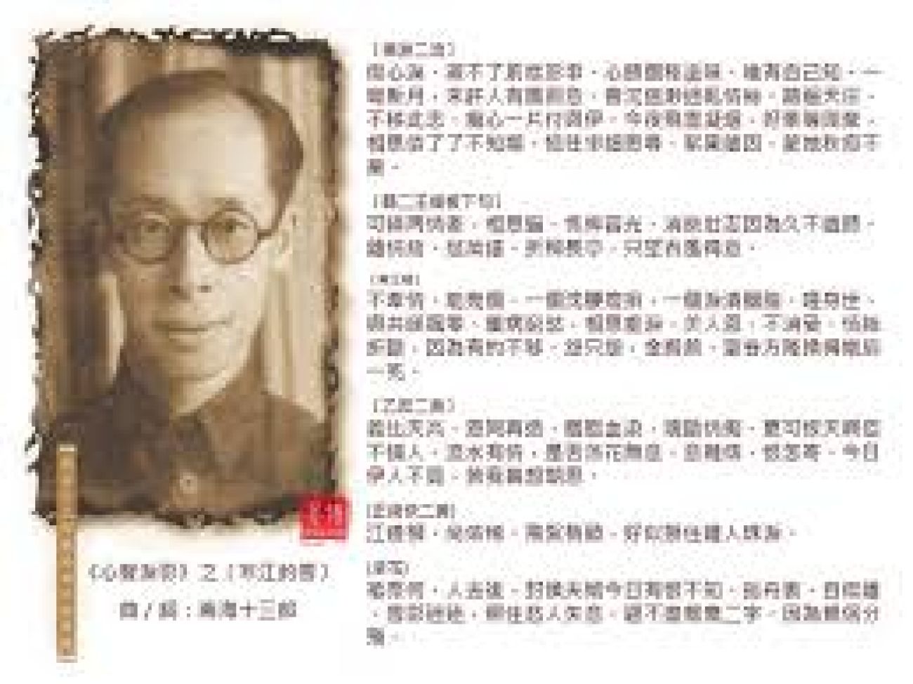 南海十三郎(江譽鏐,1910—1984)又名江楓,字絳霞。是1930年代粵劇界著名編劇,以文采斐然、至情至性著稱。他的代表作多為薛覺先主演的「覺先聲」劇團所作,經典劇目包括《女兒香》、《心聲淚影》、《燕歸人未歸》、《寒夜簫聲》等,後期作品包括《小蘭齋雜記》、《梨園二三事》等雜記回憶。