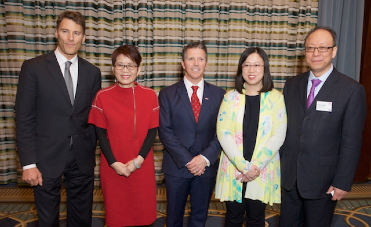 圖片: 陳納思(右二)與港加商會溫哥華分會主席Paul Gibbons(中)、卑詩省國際貿易廳長屈潔冰(左二)、溫哥華市長羅品信(左一),以及中國駐溫哥華副總領事孔瑋瑋(右一)於港加商會溫哥華分會新春晚宴上合影。