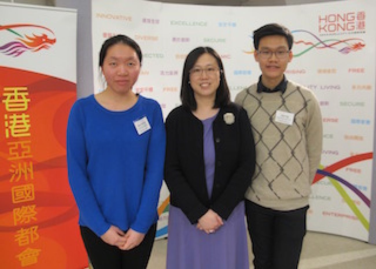 圖片說明: 陳納思 (中)與兩位香港卓越獎學金計劃得獎學生合影,他們現正在多倫多大學升讀學士學位課程。
