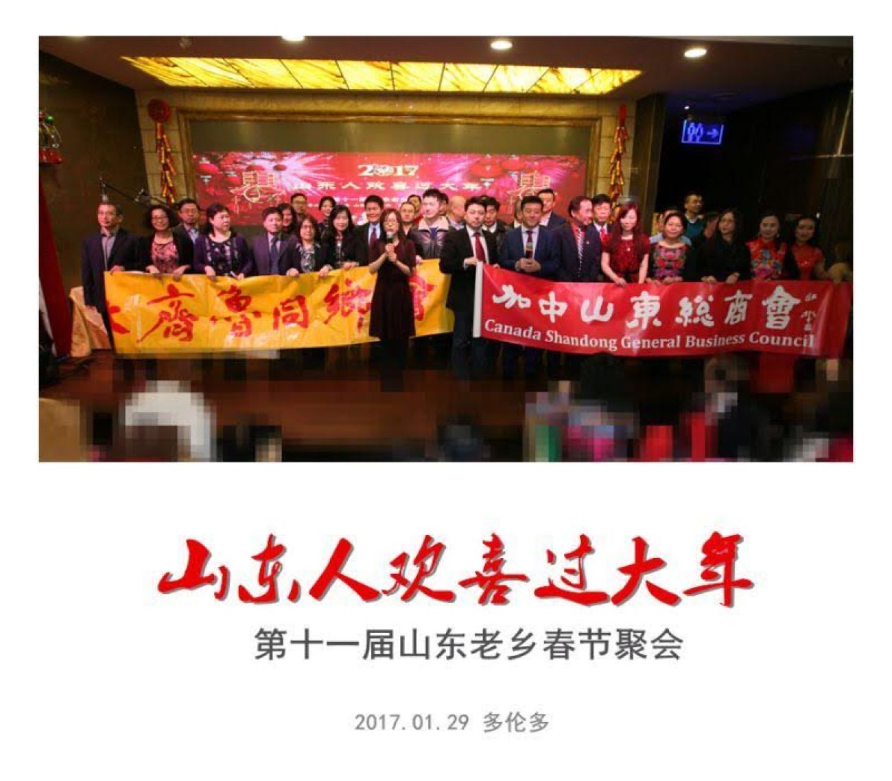 2017 年1月29日,由加拿大齊魯同鄉會、加中山東總商會主辦的【山東人歡喜過大年】春節聚會昨晚在多倫多圓滿舉行。中國住多倫多總領館、加拿大聯邦、省、市議員政要、當地華人、華僑及留學生300多人,歡聚一堂共慶中國的傳統節日春節。晚會在多倫多皇家御宴盛大舉行,節目精彩、鄉音鄉情,歡聲笑語度過了一個愉快而難忘的夜晚。