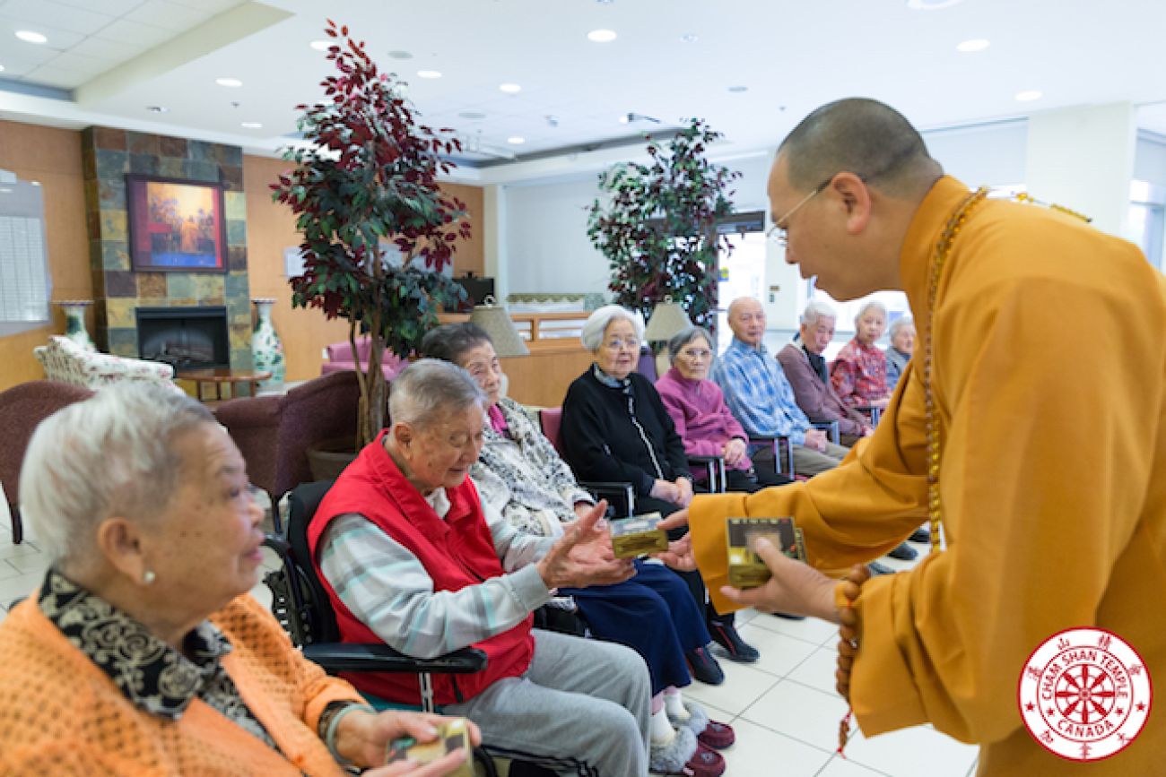 9月11日,距中國傳統的中秋佳節還有兩周。加拿大佛教會會長、湛山精舍住持達義大和尚惦念著在養老院裏不能前來湛山領取免費月餅的長者,帶領法師和義工,從早上到下午一一到達孟嘗會、頤康、耆暉等敬老院,親自將湛山素月餅派送到每位老人家的手裏,並送上節日的祝福。平時安靜的敬老院頓時充滿了歡聲笑語。