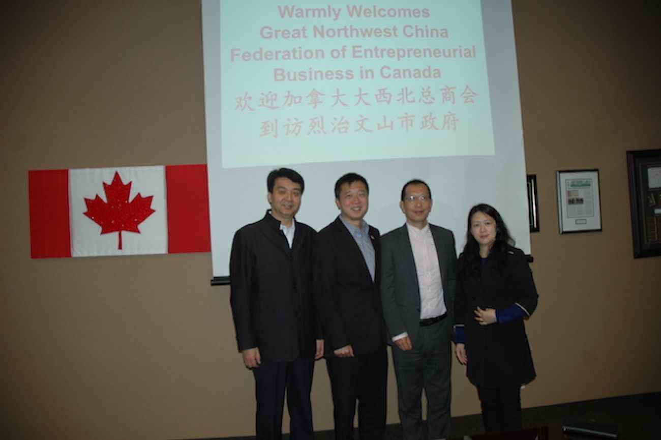 加拿大大西北總商會會長張運波,副會長劉云及秘書長朱建一日昨到烈治文山市市政府,與烈市第三區市議員廖立暉會面,簡介該會近期活動及邀請廖議員出席由該會主辦的“親情中華•魅力陝西”大型巡演活動。
