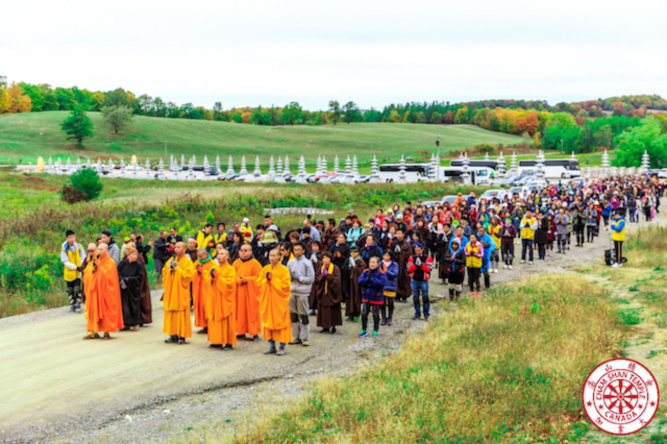 今次朝拜從早上10點開始,達義大和尚帶領信眾從加國五台山的山門開始,經過6個多小時的三步一拜,最後於下午5點到達東台文殊菩薩聖像處。