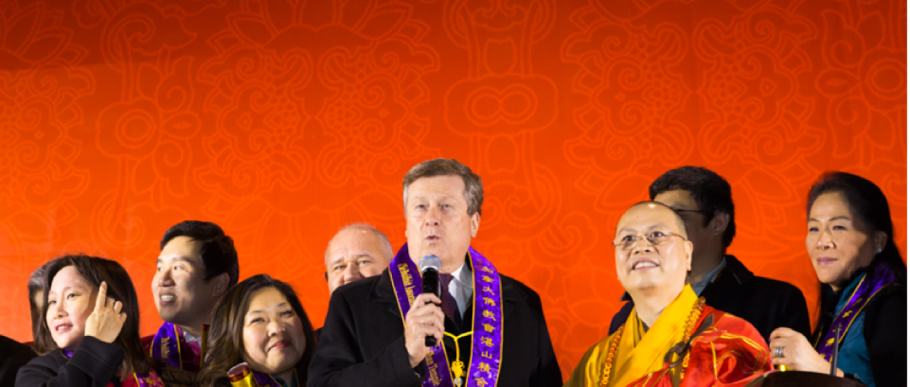 春風融雪,華燈映紅。經歷了寒冬之後,加拿大迎來了「立春」,預示著豬年的新氣象。加拿大多倫多東北部灣景大街車水馬龍,熙來攘往。加拿大佛教會湛山精舍正在這裡舉行盛大的慶祝「金豬聚福」系列活動,大眾齊來湛山上頭柱香、許願、敲鐘、點平安燈、參加廟會、接福迎新。從2月4日除夕一直到2月5日大年初一,有近萬人先後來到這裡,與加中兩國政要、僑界、商界、學界、媒體界等各界名流精英一起迎接豬年的到來。