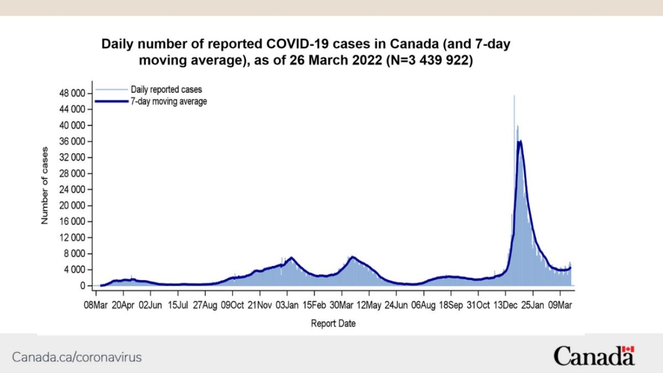 衛生部門繼續強烈建議所有符合資格條件的人及時跟進COVID-19疫苗的接種,包括那些曾經或可能曾經感染過COVID-19的人。總體來說,超過510萬符合條件的加拿大人尚需要一針或兩針來完成他們的基礎系列疫苗,還有許多人已經夠資格打加強針,這在第二針疫苗保護力可能已經減少之後幫助增強保護力,並為防止奧密克戎嚴重疾病提供更好的保護。特別是,如果您符合條件,尤其對那些50歲或以上的人,接種加強針疫苗是非常重要的。最近的研究表明,mRNA COVID-19疫苗的加強針可以增強整體的免疫反應,這可以提供更持久的保護,可能對變異毒株有更好的效果。截至3月31日,到目前為止,施打第三針疫苗的數目已經超過1780萬。截至2022年3月27日的全國數據表明,超過83%的70歲或以上的老人和61%-75%的50-69歲的老人已經接受了第三針疫苗。