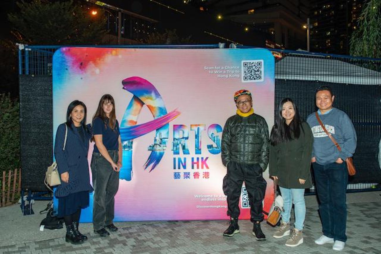 圖片:香港數碼媒體藝術家洪強博士與香港駐多倫多經濟貿易辦事處處長巫菀菁、加拿大舞蹈家Lauren Runions及其他嘉賓十月五日在加拿大多倫多市Love Park舉行的「白晝之夜」藝術展合照。