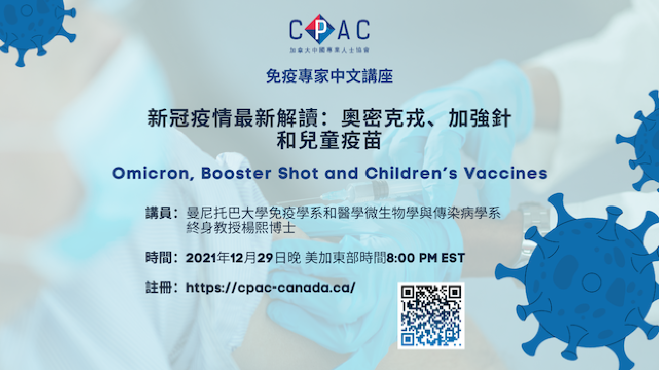 加拿大中國專業人士協會(CPAC)將於12月29日晚8點邀請曼尼托巴大學免疫學系和醫學微生物學與傳染病學系終身教授,前曼尼托巴大學免疫學系主任、加拿大感染免疫首席科學家, 楊熙博士做線上中文講座,全面介紹奧米克戎(Omicron)新變異株新冠病毒,加強針(booster)以及針對5至11歲兒童的新冠疫苗(Pfizer-BioNTech Comirnaty mRNA vaccine)。楊教授屆時還將在線上為大家現場答疑。