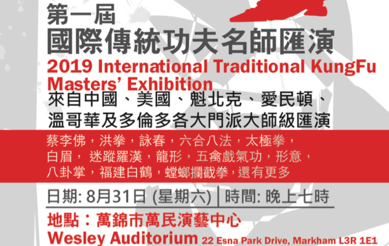 09 August 2019 即時新聞 第一屆國際傳統功夫名師匯演月杪舉行精彩可期 由加拿大武術團體聯合總會主辦,安省武術協會承辦「第一屆國際傳統功夫名師匯演」,將於8月31日(星期六)晚上7時,在萬錦市萬民演藝中心舉行,來自中國、美國、魁北克、愛民頓、溫哥華及多倫多各大門派大師級將參與匯演。 Continue reading