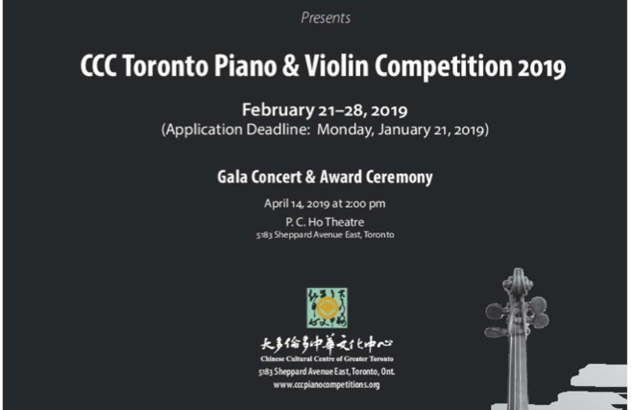 大多倫多中華文化中心自2010年開始創辦音樂節以來,今年已是第十屆。音樂節由最初每年的鋼琴比賽,至2017年新增小提琴項目,名爲『CCC多倫多鋼琴及小提琴比賽』。今年的比賽將於2月21日至28日在文化中心何伯釗劇院進行,現正接受報名,截止日期為本月21日。過往比賽反應非常踴躍,每年均收到約500份報名。一直以來文化中心很榮幸每年獲加拿大豐業銀行(Scotiabank)為此比賽的首席贊助,並獲山葉(Yamaha)任鋼琴贊助。優勝者將獲邀出席4月14在何伯釗劇院舉行的頒獎音樂會,或安排在不同季度於山葉公司的演藝中心舉行的「明日之星」音樂會演出。