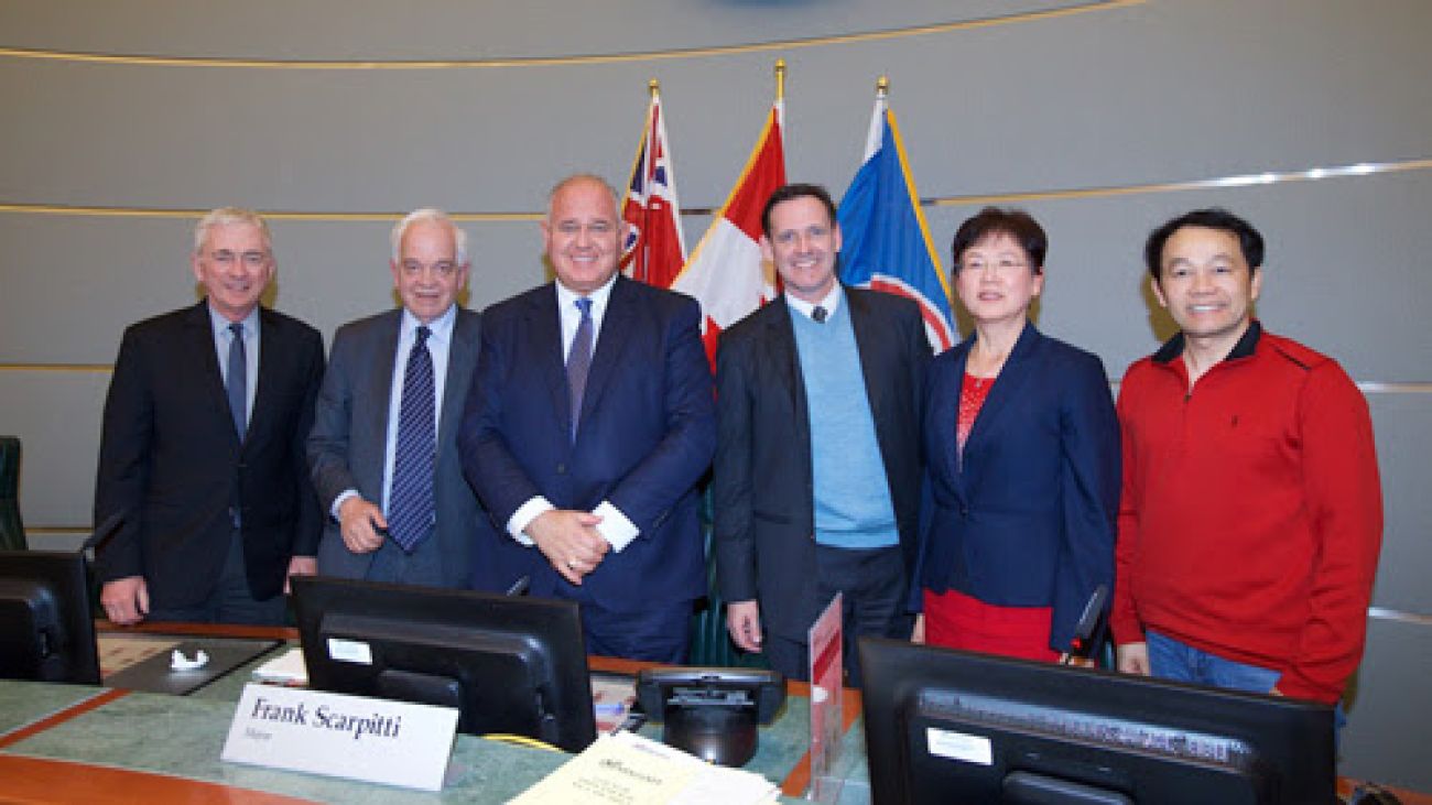 Caption: L-R: Markham Board of Trade President and CEO Richard Cunningham, Minister John MCCallum, Mayor Frank Scarpitti, Federal representative Bernie Derible, Welcome Centre representative Moy Wong-Tam and former Vietnam refugee Ming Man.