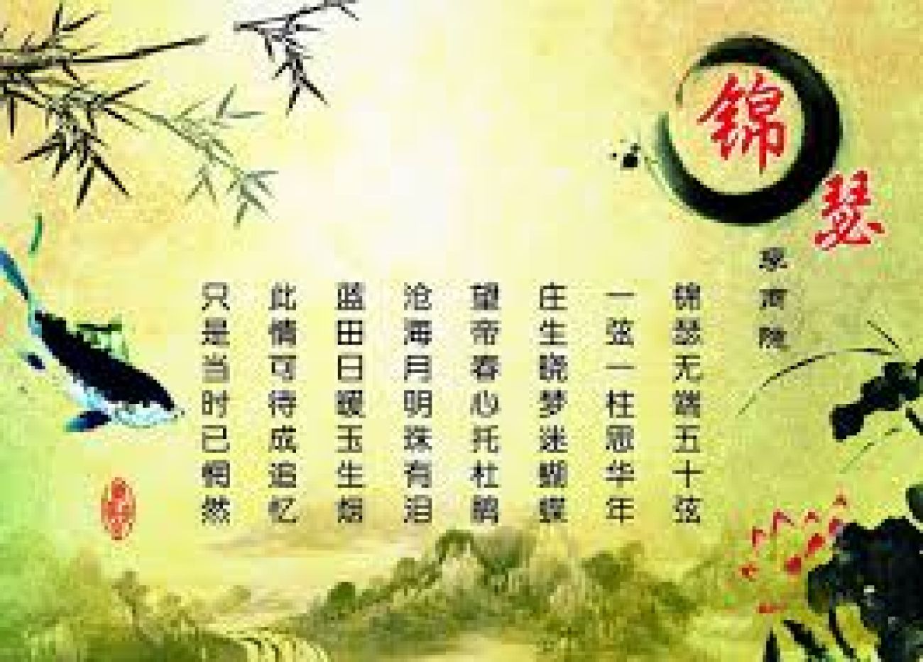 唐朝李商隱《錦瑟》中的名句:錦瑟無端五十弦,一弦一柱思華年。 莊生曉夢迷蝴蝶,望帝春心託杜鵑。 滄海月明珠有淚,藍田日暖玉生煙。 此情可待成追憶?只是當時已茫然。