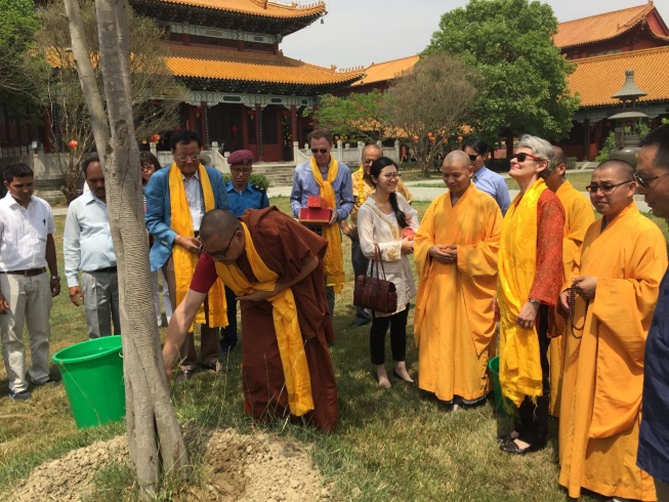 圖: 在藍毗尼中華寺接待總幹事,並共同為菩提樹澆水。