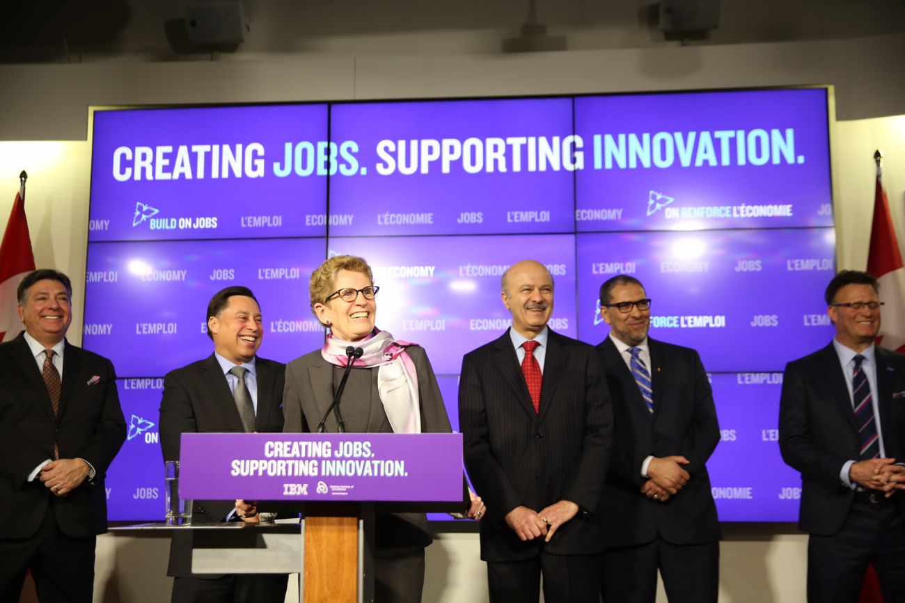 省長韋恩宣佈省府投資2,275萬元於IBM的培育創新科技項目,幫助500家中、小型公司企業創造工作,培育下一代的科學技術,並進軍全球的市場。後排為安省財政廳廳長蘇善民(左一)、安省經濟發展、就業及基建廳廳長杜傑(左二)及安省科研及創新廳廳長莫偉力(左三)。