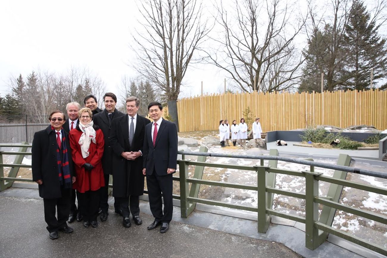 總理杜魯多(右三)﹑中國駐加拿大大使羅照輝(右四)﹑安省省長韋恩(左二)﹑中國駐多倫多總領事薛冰(右一)等在小熊貓展出場地合照。