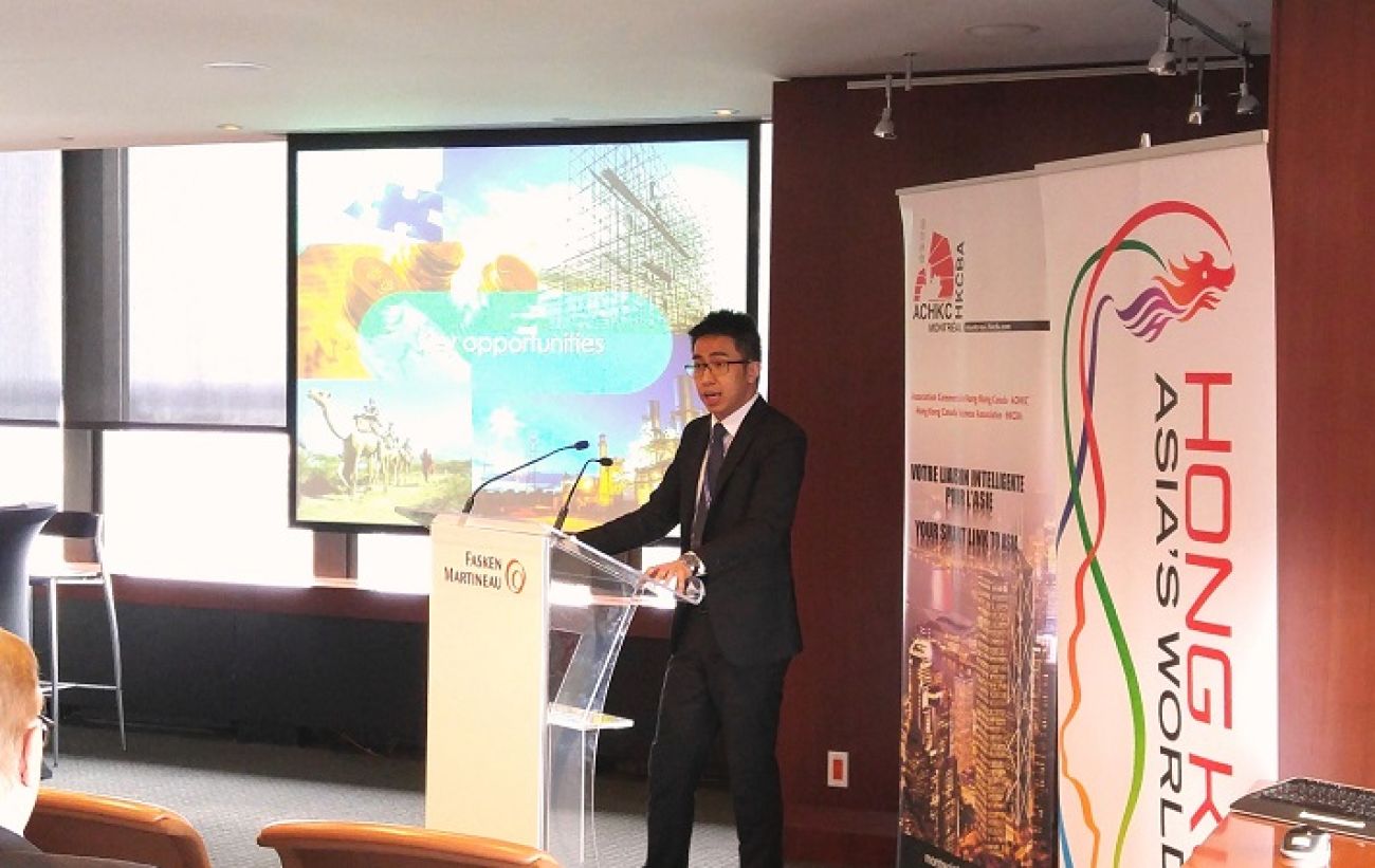 圖: 香港駐多倫多經濟貿易辦事處署理處長蔡志傑於港加商會蒙特利爾分會在蒙特利爾市舉辦的商務研討會上講解「一帶一路」策略下的商機。