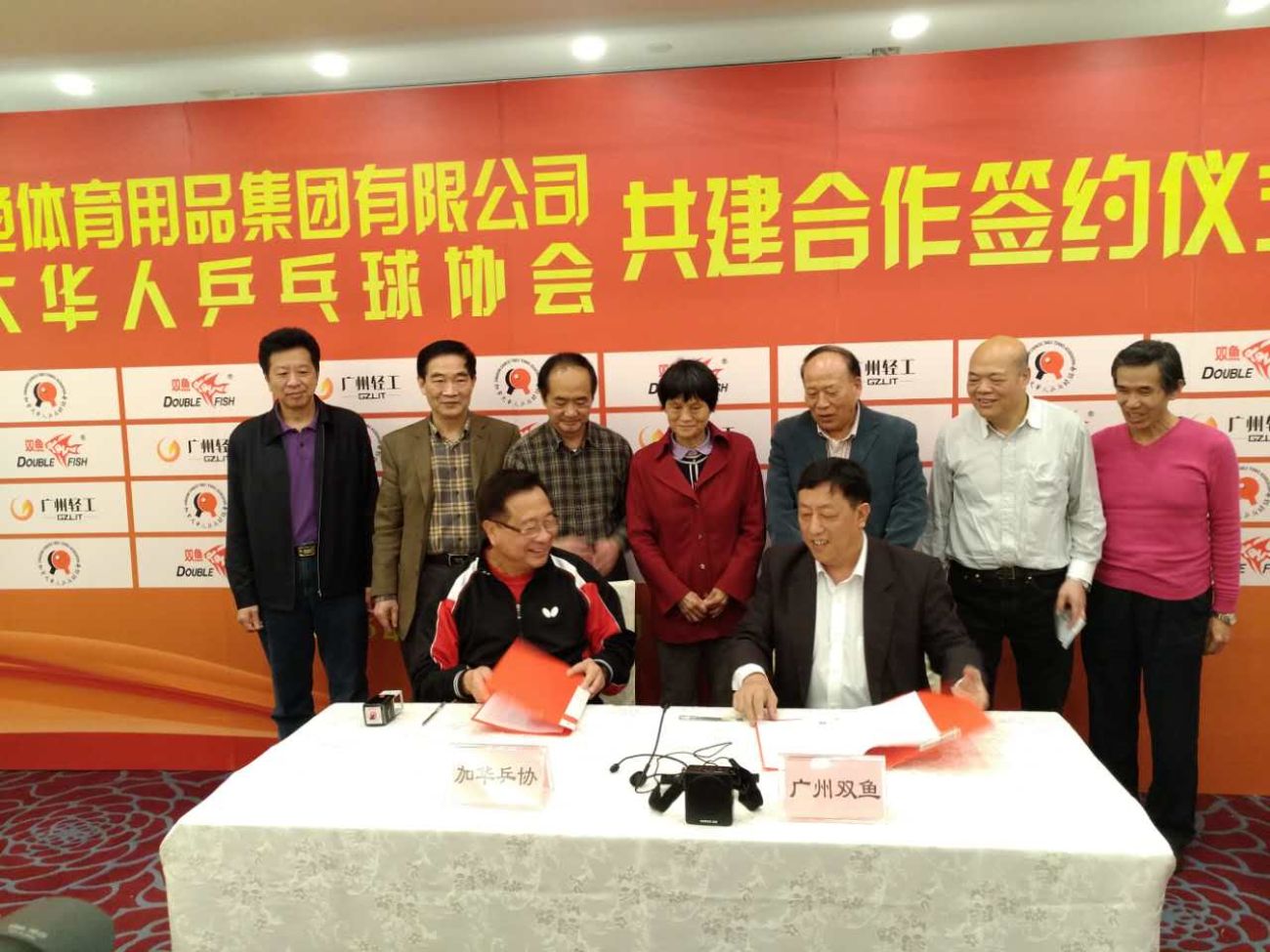 加拿大華人乒乓球協會於3月26日在廣州與雙魚體育用品集團有限公司簽署合作協議,廣州雙魚體育用品集團有限公司將會與加華乒協共同合作舉辦2016年賀國慶雙魚杯國際乒乓球邀請賽。