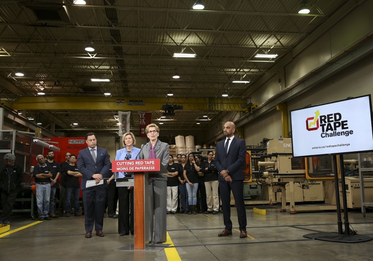 圖示﹕省長韋恩宣佈「消除繁文縟節挑戰」(Red Tape Challenge)網上運動展開。左二為社區及社會服務廳廳長何潔思(Helena Jaczek)。左為安省經濟發展、就業及基建廳廳長杜傑(Brad Duguid)。