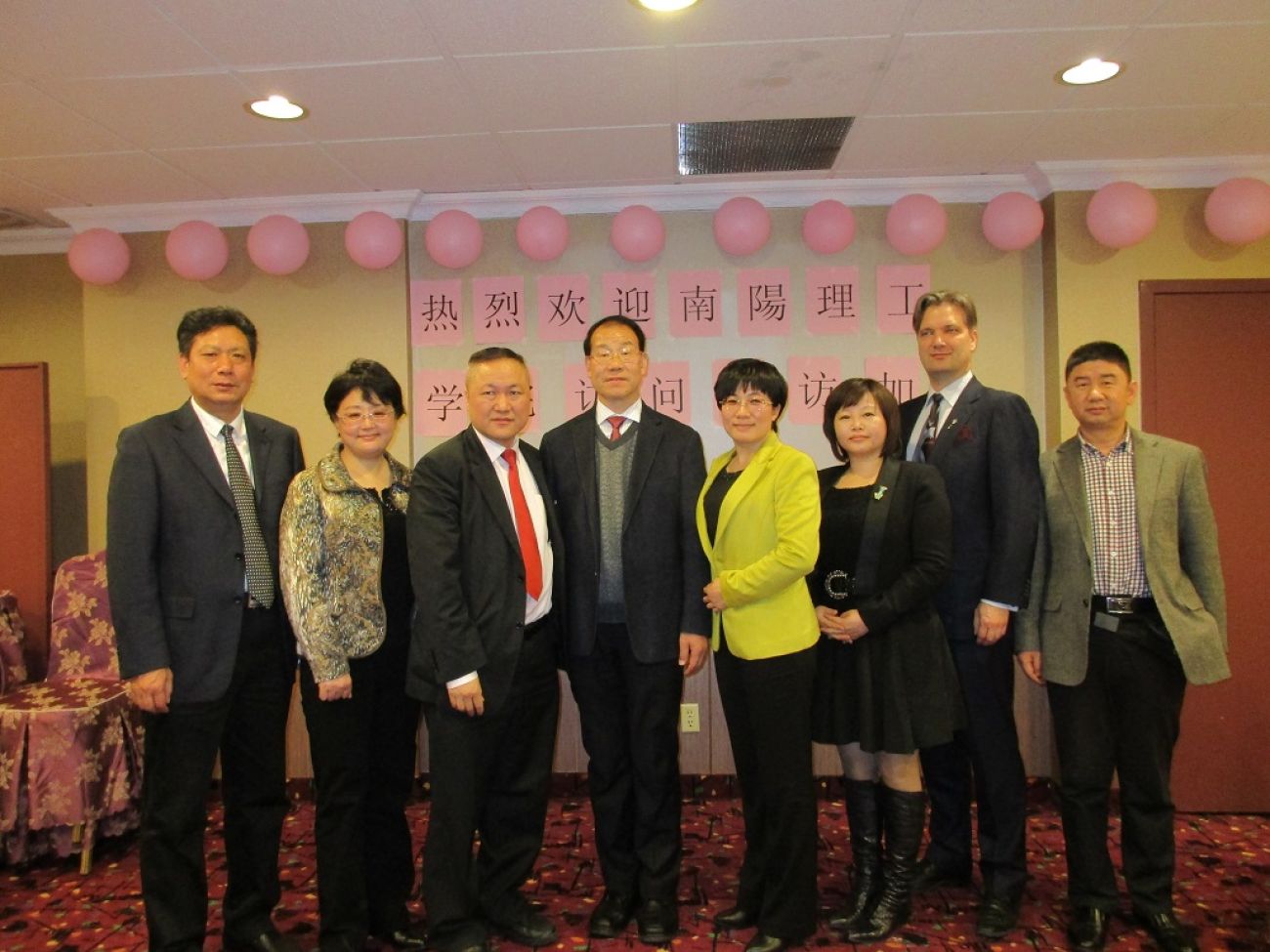 圖左起: Mr. Chen Bo,南陽理工學院Vice Bean School of Architecture & Urban Planning , Zhao Yanna國際交流合作處處長趙艷娜, 加中海外交流協會會長陸炳雄, 李宏副校長, Wang Yulei, Director President’s Office, Anderson College 負責人Heather Yang, 校長 Mihkei Ranniste 及Lu Ruifeng, Vice Dean School of Computer & Information Engineering。