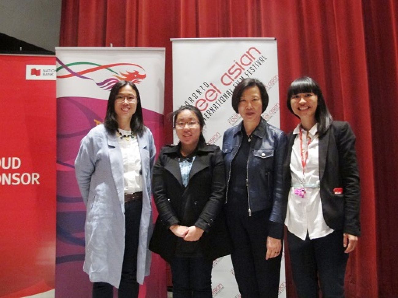 圖片說明:陳納思(左)與《爭氣》導演楊紫燁(右二)、紀錄片中其中一位學生陳曉恩(左二)及多倫多亞洲國際電影節行政總監陳樂欣(右一)在多倫多舉行的「香港勵志電影」首映禮上合照。