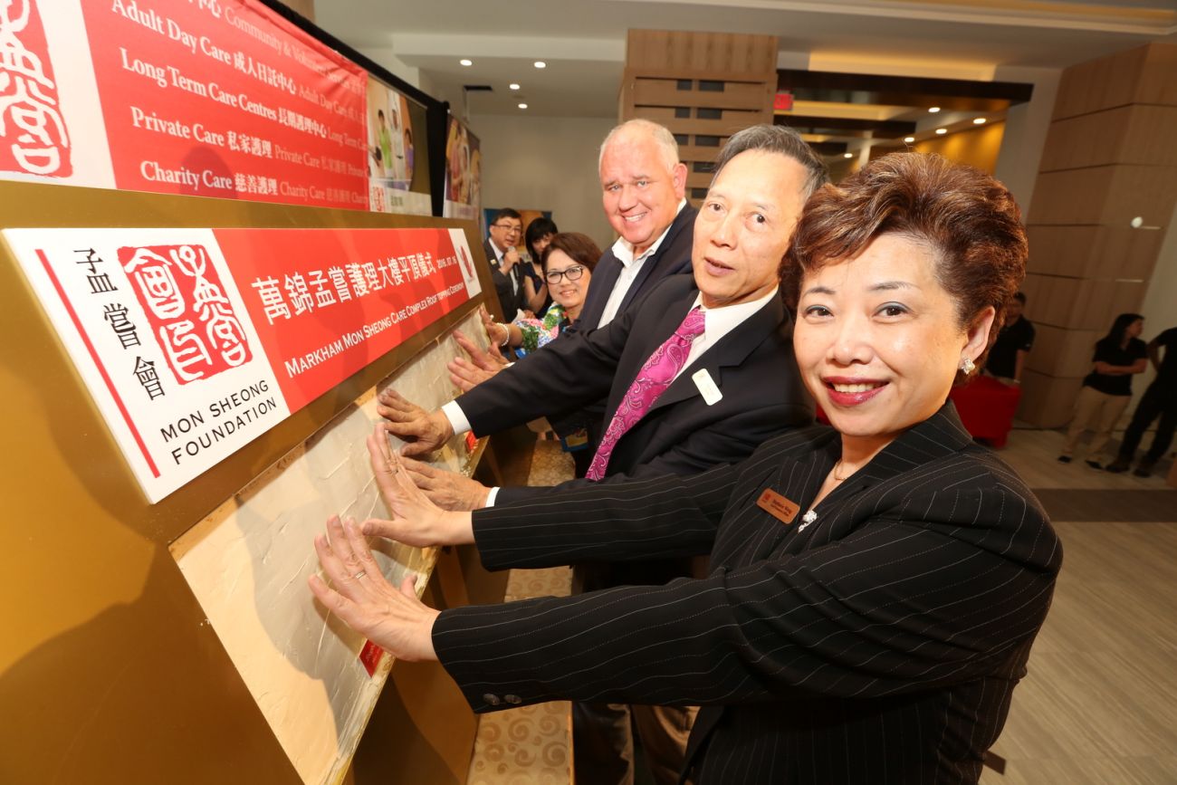 附圖:(前至後)-孟嘗會行政總裁黃何潔儀、主席關永添、萬錦市市長薛家平及會長陳劉燕玲在萬 錦孟嘗護理大樓的平頂儀式上蓋下手印。