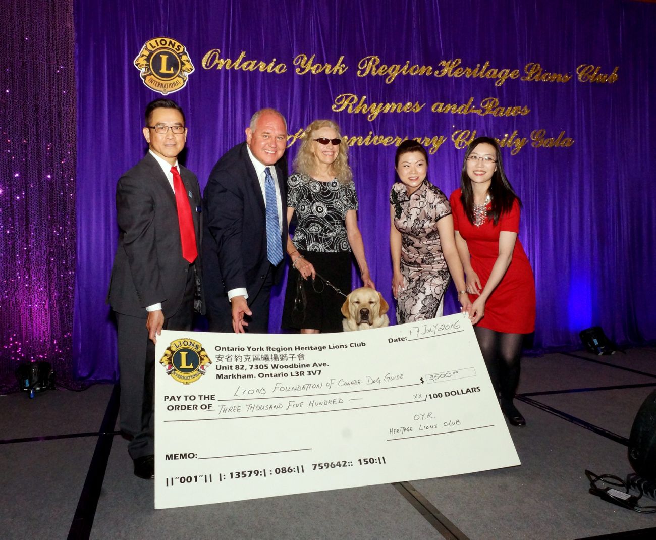 當晚慈善演唱連同獎券義賣總共籌得善款逾4000元,並安排支票頒贈儀式,由三位晚宴共同主席吳家寳小姐、李思韻小姐及會長何燦成先生與萬錦市市長薛家平一同頒贈與加拿大獅子會導引犬基金會代表。捐款詳情請瀏覽網址: www.dogguides.com 。