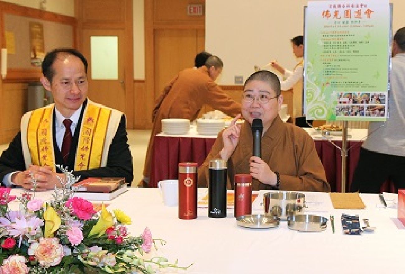 圖:2016年宗教聯合祈安法會暨佛光園遊會記者會於多倫多佛光山召開,多倫多佛光山住持永固法師與多倫多國際佛光會會長陳偉才,說明佛光園遊會推動素食環保愛地球 之理念與作法。