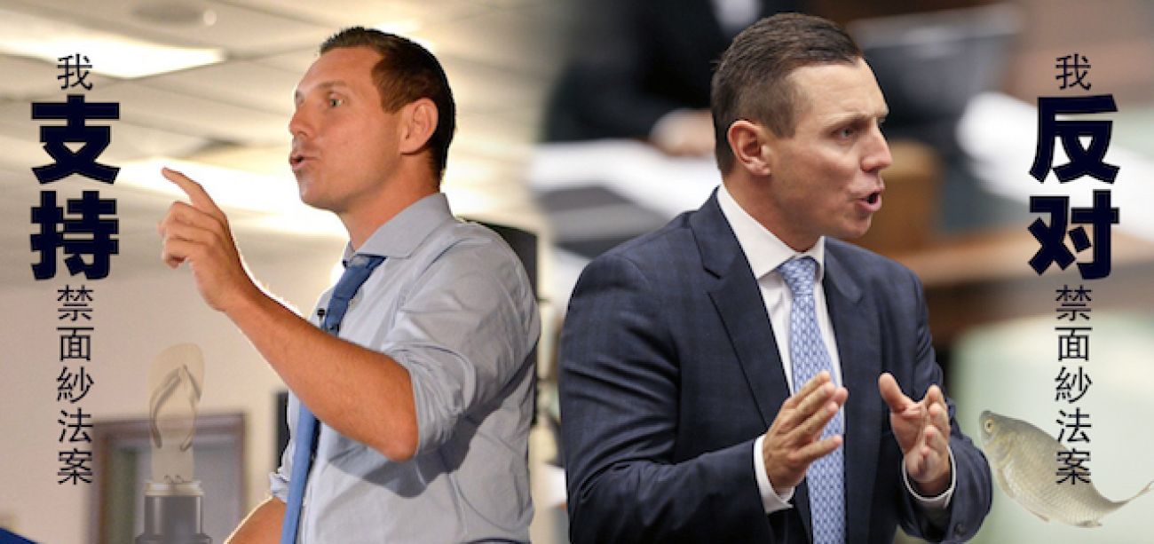 陳國治表示,值得注意的是,雖然此次三個黨都是一致反對,但保守黨的黨魁彭建邦此前曾經是讚成關於面紗的法律,現今卻是轉換了180 度的立場,表示反對。陳國治補充說,彭先生在擔任保守黨國會議員期間,曾發給選民的宣傳材料中,大力弘揚當時的聯邦保守黨政府關於強制面紗的法律。然而此一時彼一時,彭先生的態度來了一個大翻轉,彭黨魁船板魚翻來覆去的伎倆,又來了!