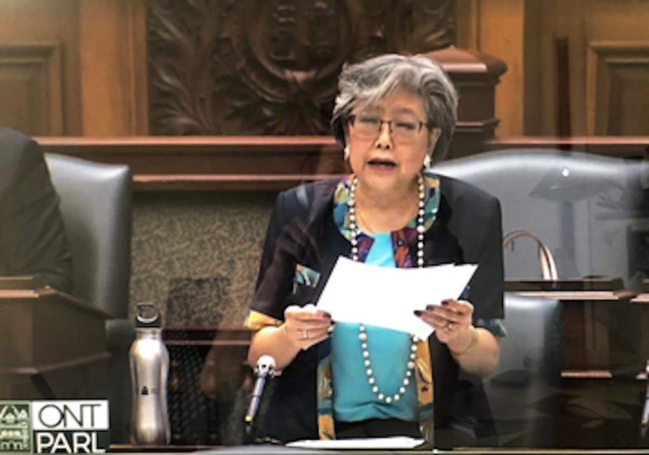 圖:烈治文山省議員韋邱佩芳在省議會上就9號法案陳詞。