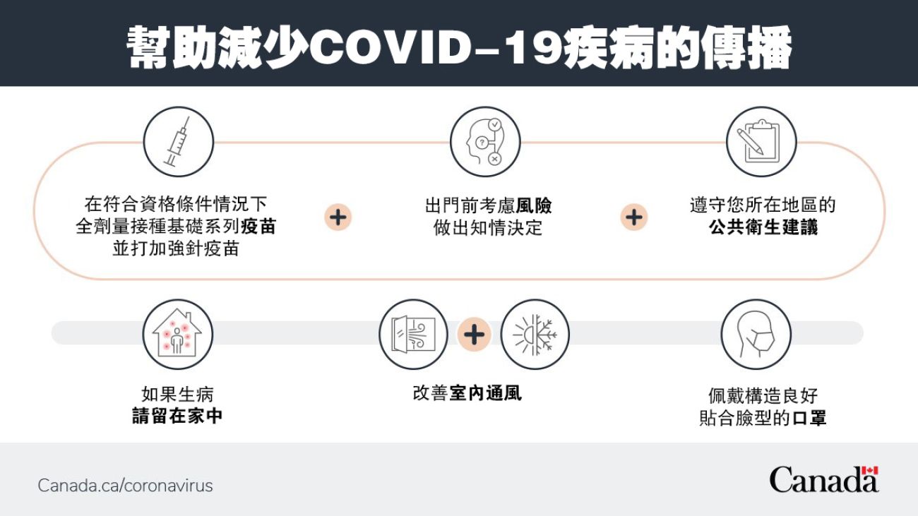 正如我們所說,保持一種準備狀態,就是我們在未來一段時間的最佳優勢。加拿大公共衛生當署將繼續調整併公佈相關的指引和建議,以在情況發生變化之時為我們提供指導。在個人層面,除了保持及時接種 COVID-19 疫苗之外,做好準備的最佳方式就是繼續遵循公共衛生建議,這些建議都是根據當地流行病學數據和情況而量身定制的,以幫助指導您的個人和家庭風險評估,並幫助您決定個人防護措施的使用,例如戴口罩等。