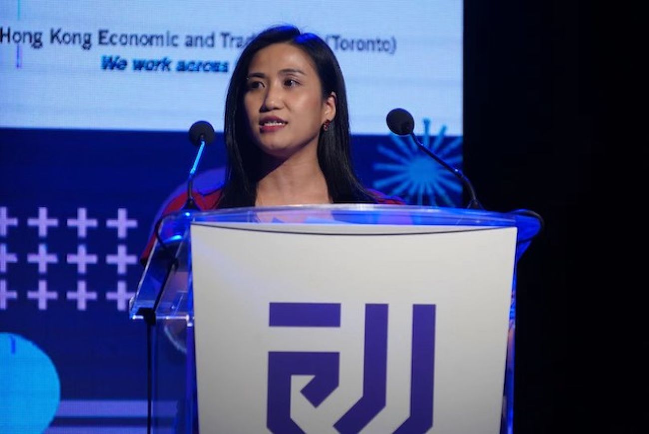 圖片:香港駐多倫多經濟貿易辦事處(香港經貿處)處長巫菀菁於四月二十三日出席創業協進會舉辦的加拿大傑出華裔創業家2022頒獎晚宴並致辭。
