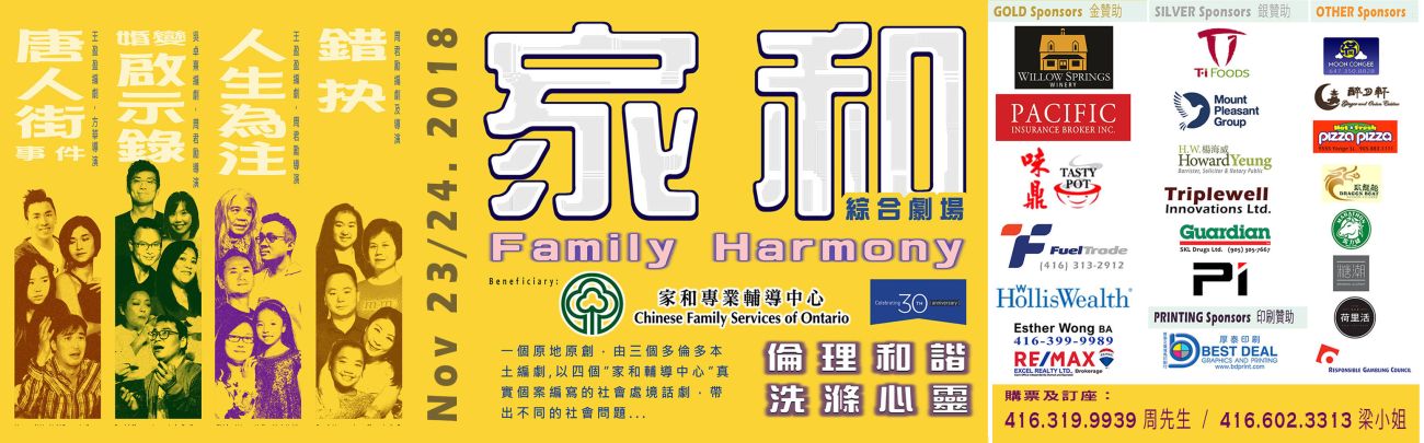 勵文社週年壓軸重頭戲--慈善話劇【家和】綜合劇場是門票現已公開發售。票價分$30、$40、$50、$60 及VIP $100。$50 以上門票九月底前訂購可享受八折晨鳥優惠。訂座及查詢,可致電416-319-9939 周先生、或416-602-3313 梁小姐,