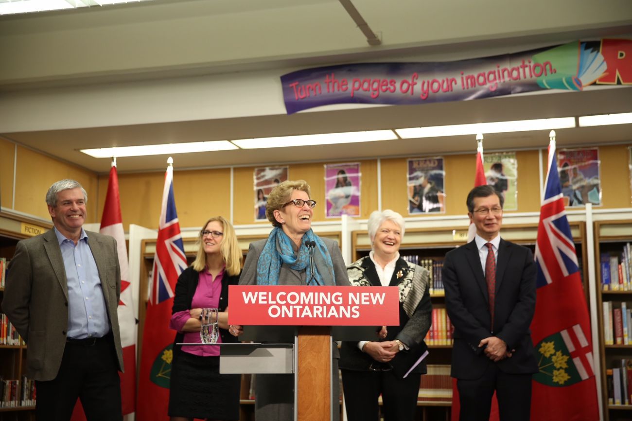 省長韋恩作出再撥款給幫助難民的機構。後排右一為安省公民移民及國際貿易廳廳長陳國治、右二為教育廳廳長單杜絲(Liz Sandals)。