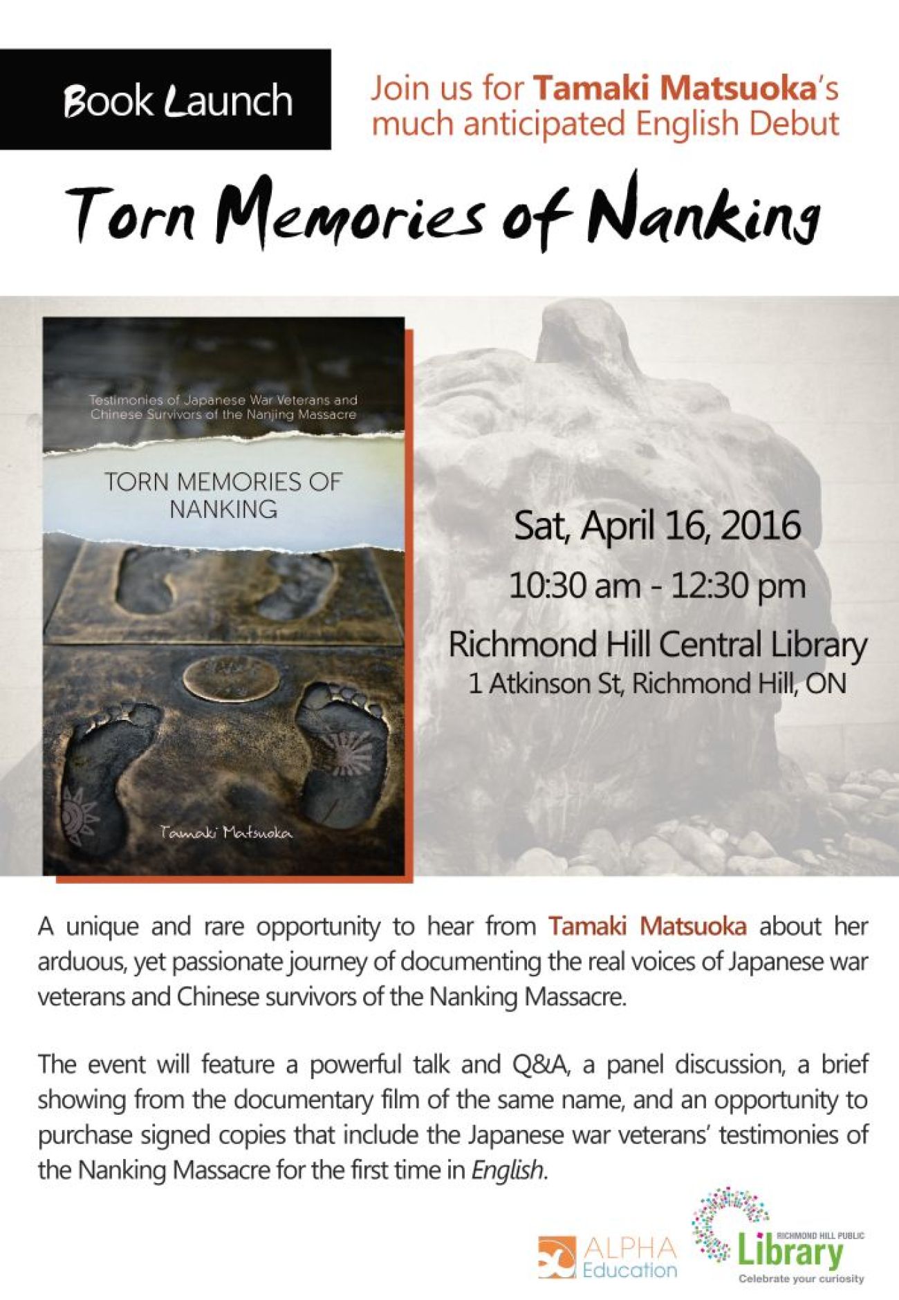 15 April 2016 即時新聞 「南京: 被撕裂的記憶」新書明天舉行發佈會 多倫多一位日本的女教師,為了維護公義和歷史真相,花了二十多年的時間找尋和探訪南京大屠殺受害者和加害者,並蒐集他們的證言,編輯成書和製成紀錄片。 Continue reading
